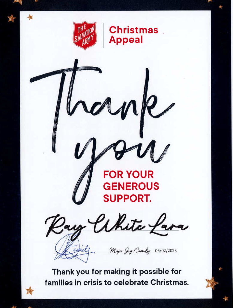 At Ray White Lara, we understand the importance of supporting our local community, we are pleased to have the opportunity to make a meaningful contribution to the residents of the northern suburbs of Geelong through our partnership with The Salvation Army Northside Geelong Church and Community Centre during the Christmas season.